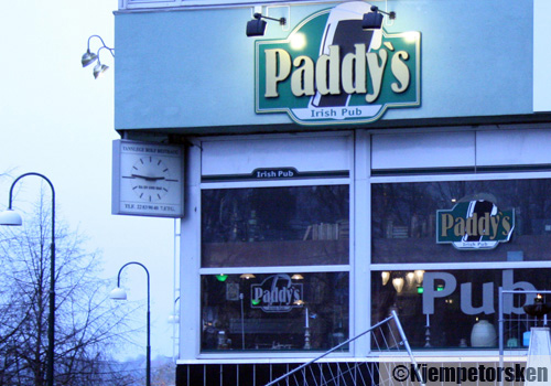 Paddy’s er en god, gammel pub i typisk engelsk pubstil. Her finnes dype skinnsalonger, barkrakker og mørkt treverk. Her får du Frydenlund, Guinness og Newcastle Brown på fat og et par hveteøl på flaske. Ikke veldig imponerende, men godt over gjennomsnittet. Fin uteplass. Serverer toast med ost og skinke og irish stew.