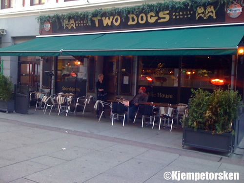 Two Dogs ligger i den veibiten av Brugata som er gågate. Fin beliggenhet, og puben har en fin uteplass som er «åpen» hele året. Dette er først og fremst en fotballpub. Her vises det fotball på 9 store TV-skjermer nesten uavbrutt, og det sitter som oftest fotball»supportere» ikledd engelske lags drakter rundt omkring.