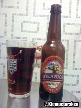 Litt lys juleølfarge. Lukter hjemmebrygg som ikke er gjæret helt ut. Smaken er imidlertid nydelig. Masse røyksmak og kaffe. Litt villmark. Kraftig og god. Og veldig spesiell. ABV: 5 Style Seasonal Brewery Ölvisholt Brugghús Region Iceland