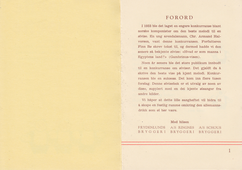 Øl-visene var et samarbeidsprosjekt mellom de tre tidligere Oslo-bryggeriene Frydenlunds Bryggeri, A/S Ringnes Bryggeri og A/S Schous Bryggeri. Dette var rett og slett et lite sanghefte med ølsanger som ble laget på grunnlag av en konkurranse i 1933 (se side 2 nedenfor for detaljer). Syng i vei!