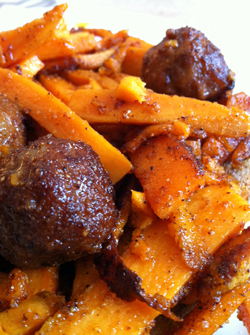Skjær opp søtpoteten i pommes frites-aktige strimler. Stek med mye smør/margarin i stekepannen. Dryss tacokrydderet over potetstrimlene og vend dem så ofte du husker. Smak gjerne til med salt og pepper, men ikke overdriv! Dette skal gå raskt, og du dekker uansett ikke på med sølvtøyet her. Kjøttbollene putter du i stekepannen omtrent halvveis i stekingen, og du kan slå av platen når det ser ferdig ut. Tøm alt sammen over brødskiven(e) og hugg inn! Orker du en øl til, så anbefaler jeg den som står nærmest. Ønsker du å føle deg ørlite bedre i morgen drikker du vann til.