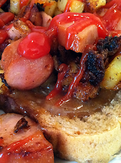 Skjær opp pølser og poteter i ønskede skiver og legg dem i stekepannen med en god dæsj smør eller margarin. Det må være såpass mye stekefett at alle bitene glinser (og gjerne drypper) når du tar dem ut av stekepannen. Legg brødskivene på en tallerken og sprut Bergbys sennep (den søte typen!) utover slik at det dekker det meste av brødkivene. Legg deretter de ferdig stekte pølse- og potet-bitene over og sprut en rikelig mengde med Idun Chiliketchup over. Tilsett gjerne krydder også. Ønsker man å virkelig ta den helt ut, kan man tilsette ost mot slutten av stekingen. Revet pizzaost, Jarlsberg eller smøreost på tube kan brukes. Det er til og med mulig å bruke geitost! Men det må være den ekte typen. Undervurdert!