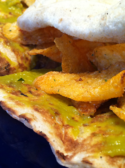 Her skal man helst bruke den nanbrød-typen som er rundt 40 cm i diameter og veldig myk (fåes fersk i de fleste innvandrerforretninger og heter Nani Tendur). Legg Nanbrødet på tallerkenen og smør tykt på med dip. Når hele flaten er dekket med dip, strør du Sørlandschips utover halve flaten. Tett i tett! Brett deretter den ufylte delen over den fylte og trykk lett slik at chipsen brekkes opp og flates ut. Sett i mikrobølgeovn og kjør på full styrke i 30 sekunder.