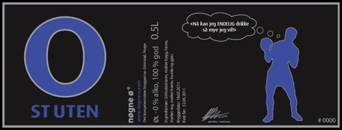 Oppmerksomme Nøgne Ø-drikkere vill også ha oppdaget at den karakteristiske Ø-logoen er byttet ut med en 0 (null). Fiffig! 0% alko – 100% god. Etiketten røper også at ølet kommer i 0,5-litersflasker. Hva den blå bokseren skal symbolisere har jeg ennå ikke funnet ut av… Forslag mottas!