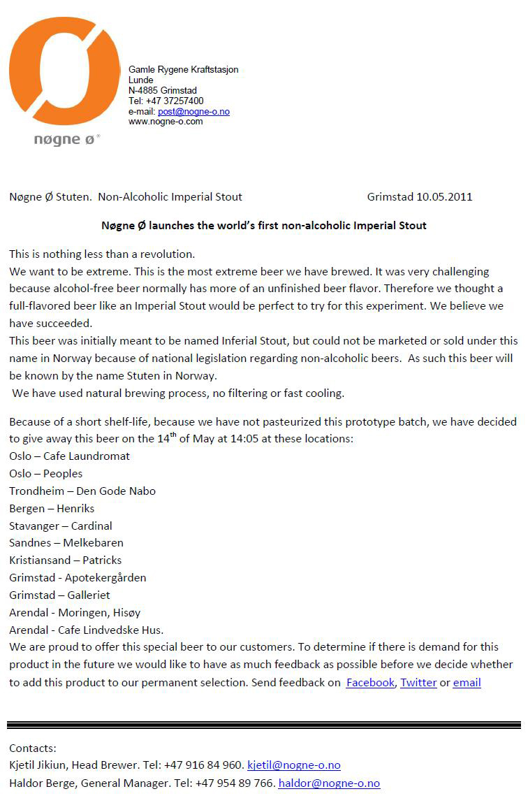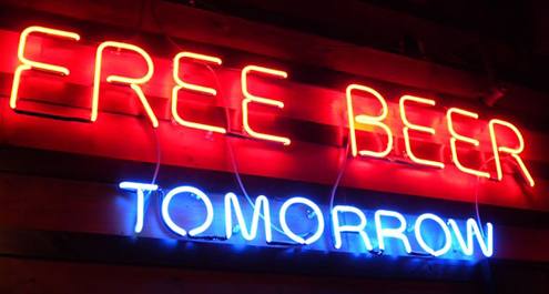 Neonskiltet er legendarisk. Et godt og selgende budskap, som ikke trenger å oppfylles før i morgen. Men akkurat i dag er det faktisk sant! Norges fremste bryggeri, Nøgne Ø Det kompromissløse bryggeriet, vil faktisk dele ut gratis øl i morgen! Jeg vil tro det er første gang dette skjer i norgeshistorien. Her er pressemeldingen fra bryggeriet (trykk for større versjon):