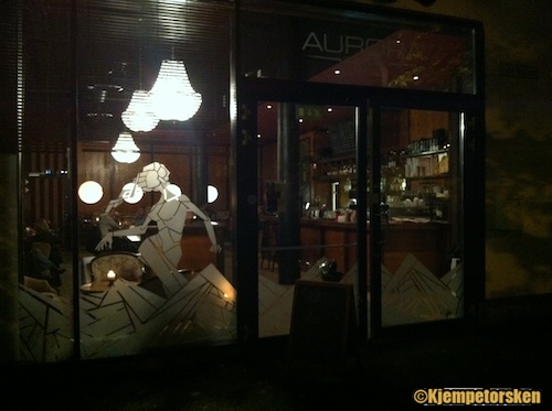 Etter mitt syn har Aurora først og fremst et identitetsproblem. Fra utsiden ser stedet ut som en moderne restaurant. Foran baren ser det ut som en fin ølbar, men snur man seg mot lokalet og sitteplassene ser mer ut som en tapas- og vinbar. Dette understrekes av at de få som sitter her drikker vin eller Leffe Blond. Interiøret er i sort, brunt og trerødt. Fint og påkostet med 3 prangende lysekroner (Aurora?) og store puter i sofagruppene.
