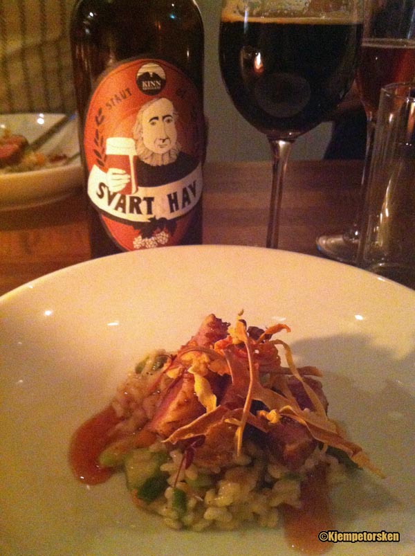 Jeg vil også fremheve Kinn Svart Hav som vi fikk servert til andebrystet. Det er en fantastisk stout med mye smak og herlige malt-toner. Helt utrolig at denne smakfulle ølen holder seg innenfor butikkstyrke! Den smaker minst det dobbelte (i %). Perfekt til det forholdsvis fete andekjøttet.