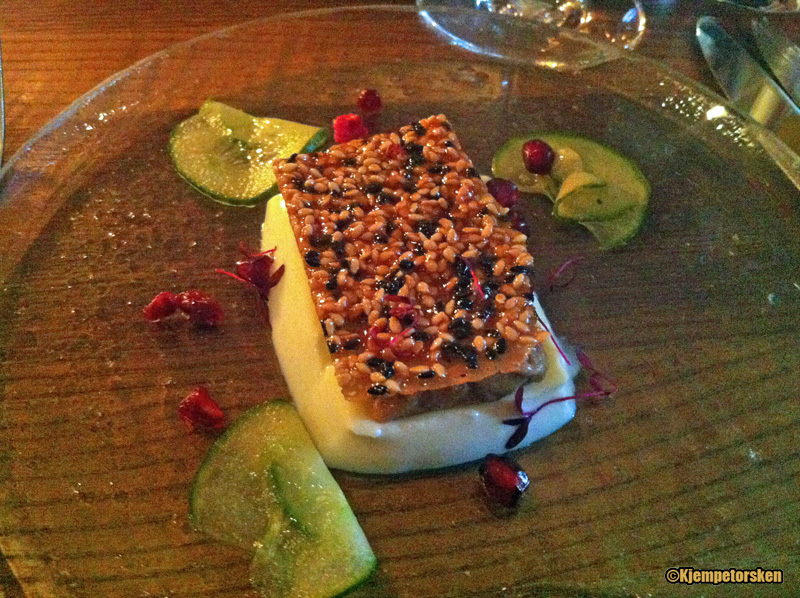 - Humlepannacotta med Kinn Veskyst – toppes med Foie Gras terrine, agurksalat, sesamkrisp og granateple