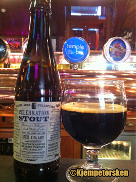 The Porterhouse’ Celebration Stout leveres i 2 versjoner. Denne fatlagrede på 11% og en «vanlig» på 7%. I utgangspunktet visste jeg ikke om denne fatlagrede versjonen da jeg bestilte «Celebration Stout» på The Porterhouse i Dublin. Jeg trodde jeg fikk den «vanlige» 7%-versjonen, men flasken som bartenderen allerede hadde åpnet var altså denne fatlagrede versjonen på 11%! Jeg hadde allerede hatt et par øl denne dagen (man befant seg jo i Dublin, må vite!), så i utgangspunktet var jeg ikke helt klar for å drikke denne kraftpluggen alene. Riktignok kommer denne i 0,33-flasker, men det er mer enn nok når man har tenkt å smake på noen flere øl samme dag. Jeg spurte min sidemann om han ville dele flasken med meg, men han var godt på vei ned i et glass med Porterhouse Brainblasta, så han takket pent nei.