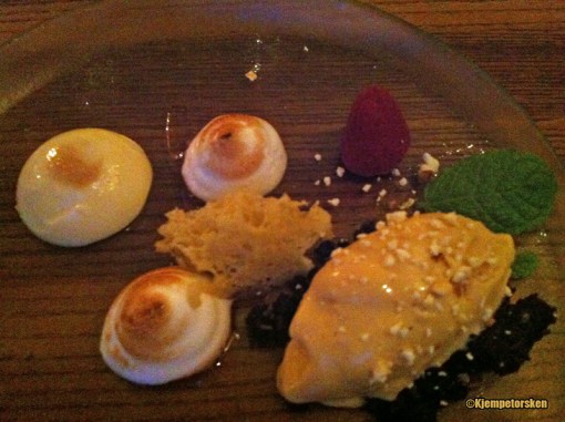 Til dessert fikk vi en liten overraskelse: Brunost-is, variasjon av lakris, sjokolademaltjord og bringebær. Brunost-is høres merkelig ut, men det smakte himmelsk. Assosiasjonen lå mer mot karamell enn brunost, og sjokolademaltjord var et spennende tilbehør. Smaksrikt og uvant konsistens. En frisk og god dessert med en konge av et øl til følge: Nøgne Ø Imperial Stout Cognac Barrel!