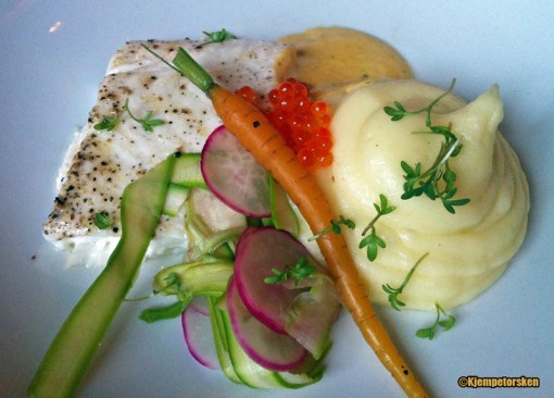 Dagens fiskerett var Lav-temperert Kveite, potetpuré, krem av kamskjellrogn, dampede primører og lakserogn. Smaksmessig synes jeg dette var kveldens høydepunkt og Nøgne Ø Tripel var et perfekt følge. Den kremete og smaksrike fisken var perfekt tilberedt og garnityret satte akkurat den rette spissen på retten. Nydelig!