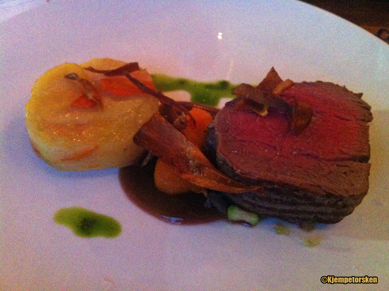 Hovedretten var Indrefilét av okse med rotfrukt-terrine, gulrotpuré, ramsløkolje og røkt maltsky. Igjen en nydelig rett, perfekt tilberedt med riktig så gode smaksopplevelser. Enkelte rundt bordet mente at Nøgne Ø Imperial Brown ikke var en like god match til denne retten som kombinasjonene i de andre rettene vi fikk servert, men jeg synes den var midt i blinken. Men så er også Imperial Brown Ale en av mine absolutte favoritter fra det kompromissløse bryggeriet!
