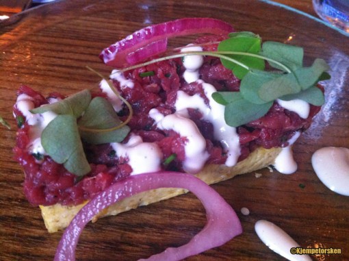 Deretter fikk vi Portermarinert oksetartar servert på omelett med Northern Brewer humle og engsyre og emulsjon av Nøgne Ø Brun. Nøgne Ø Brun ble servert til, og passet perfekt til denne spennende retten!