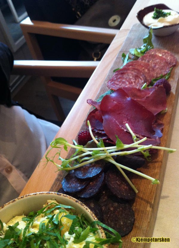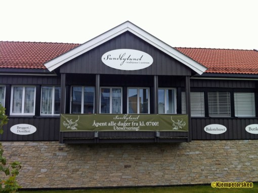 13.30 gikk vi opp i restauranten der vi var ventet. Et koselige vindusbord stod klart og menyen kom «flytende» på en fjøl. Selvfølgelig! Sundbytunet satser på lokale råvarer med vekt på tradisjonell norsk (bonde)kost. Et flott konsept i en by som i stor grad er preget av fastfood-sjapper og pizzarestauranter.