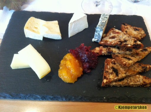 Den nevnte ostetallerkenen var en fantastisk avslutning på måltidet, med prisvinneren Kraftkar fra Tingvoll som stjerne på skiferplaten. Fyldige og smaksfylte marmelader og rikelig med ferskt, saftig nøttebrød fulgte med. Så får det heller være at servitøren måtte ta en ekstra runde på kjøkkene da vi spurte hvilke oster vi fikk servert. Måltidet som helhet fortjener all mulig ros. Her skal vi helt klart spise flere ganger! Takk for en koselig dag!