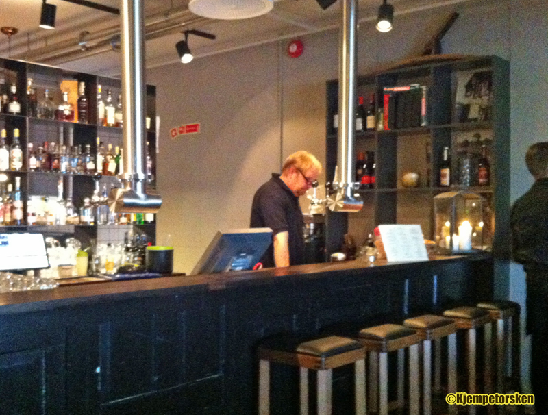 Vi hadde bestilt bord til 13.30 og ankom Jessheim med tog en times tid før. Fra togstasjonen er det noen få minutters gange nordover, og et flott syn som møter deg når du kommer frem. Staselige bygninger, pent opparbeidet med grøntarealer og fine omgivelser. Vi rakk en rask tur rundt tunet og satte oss ned for å ta en øl i Bryggerikjelleren. I påvente av den kommende Bybayer var det kun Kjellerpils, Emigrant IPA og Blond på kranene. Jeg gikk for en Blond. Kjellerpilsen hadde jeg allerede innkjøpt på flaske fra Handleriet i etasjen over. Anmeldelser av disse ølene kommer på bloggen snart. Bryggerikjelleren er moderne og koselig innredet med flotte sittegrupper og en koselig peis innerst i lokalet. Bryggverket kan beskues bak den flotte baren, og ved siden av går en trapp opp til restauranten.